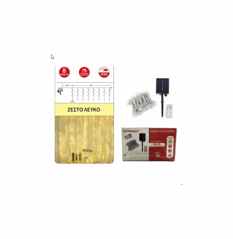 240 Ηλιακά Χριστουγεννιάτικα Λαμπάκια Κουρτίνα LED με Πρόγραμμα & Χειριστήριο Ζεστό Λευκό 3×1.20m IP44 με Διάφανο Καλώδιο Arrango AN48382