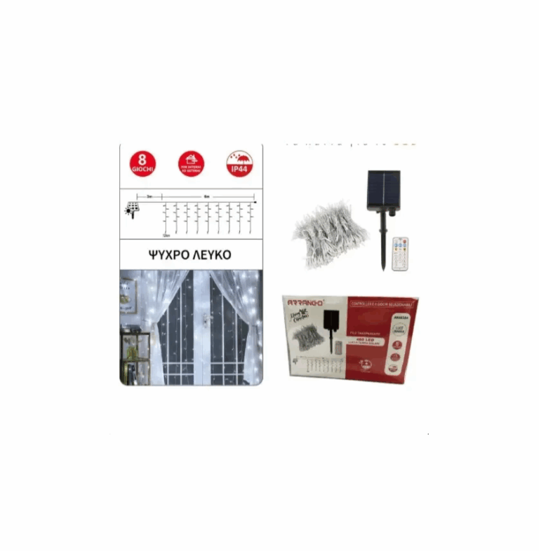 480 Ηλιακά Χριστουγεννιάτικα Λαμπάκια LED Κουρτίνα με Πρόγραμμα & Χειριστήριο Ψυχρό Λευκό 6×1.20m IP44 με Διάφανο Καλώδιο Arrango AN48384