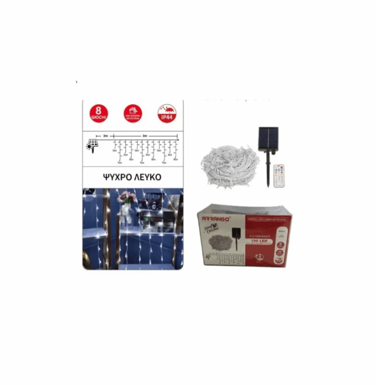 240 Ηλιακά Χριστουγεννιάτικα Λαμπάκια Κουρτίνα LED με Πρόγραμμα & Χειριστήριο Ψυχρό Λευκό 3×1.20m IP44 με Διάφανο Καλώδιο Arrango AN48381