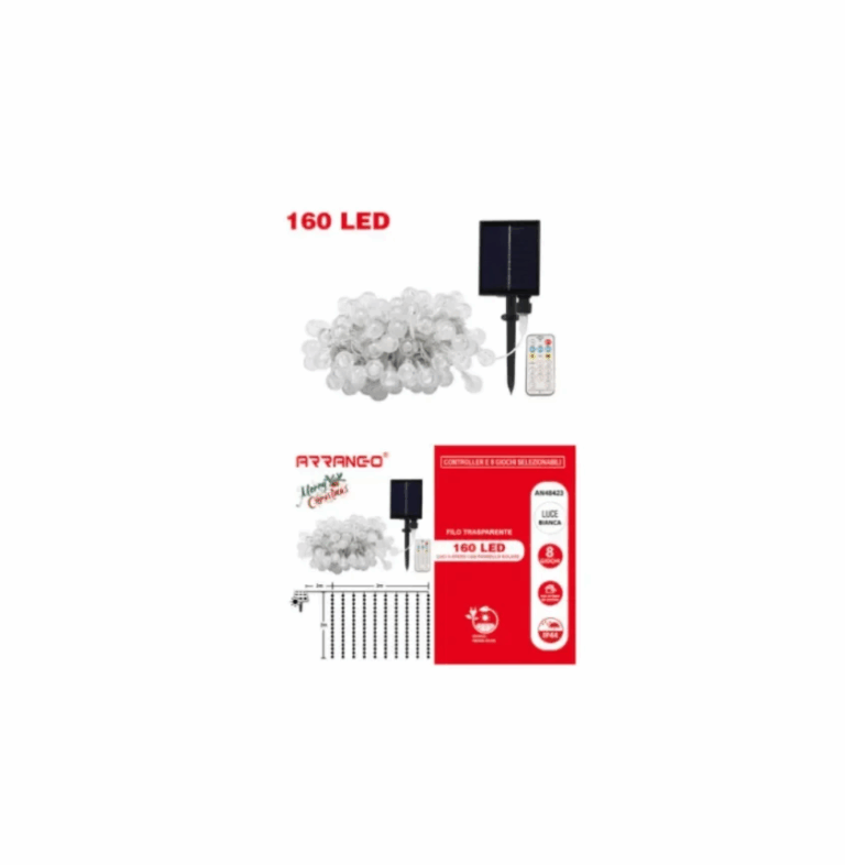 160 Ηλιακά Χριστουγεννιάτικα Μπαλάκια Κουρτίνα LED με Πρόγραμμα & Χειριστήριο Ψυχρό Λευκό 3x2m IP44 με Διάφανο Καλώδιο Arrango AN48423