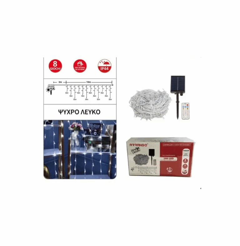 380 Ηλιακά Χριστουγεννιάτικα Λαμπάκια Βροχή LED με Πρόγραμμα & Χειριστήριο Ψυχρό Λευκό 10m x30-40-60-70cm IP44 με Διάφανο Καλώδιο Arrango AN48369