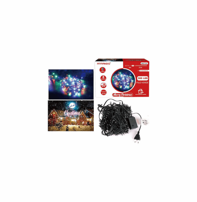 300 Χριστουγεννιάτικα Λαμπάκια LED Πολύχρωμα 21μ σε Σειρά με Πράσινο Καλώδιο και Προγράμματα Arrango AN57306 32781756