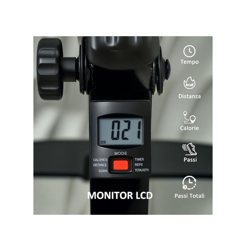 • Οθόνη LCD με πληροφορίες για χρόνο, απόσταση, θερμίδες, βήματα και συνολικά βήματα.