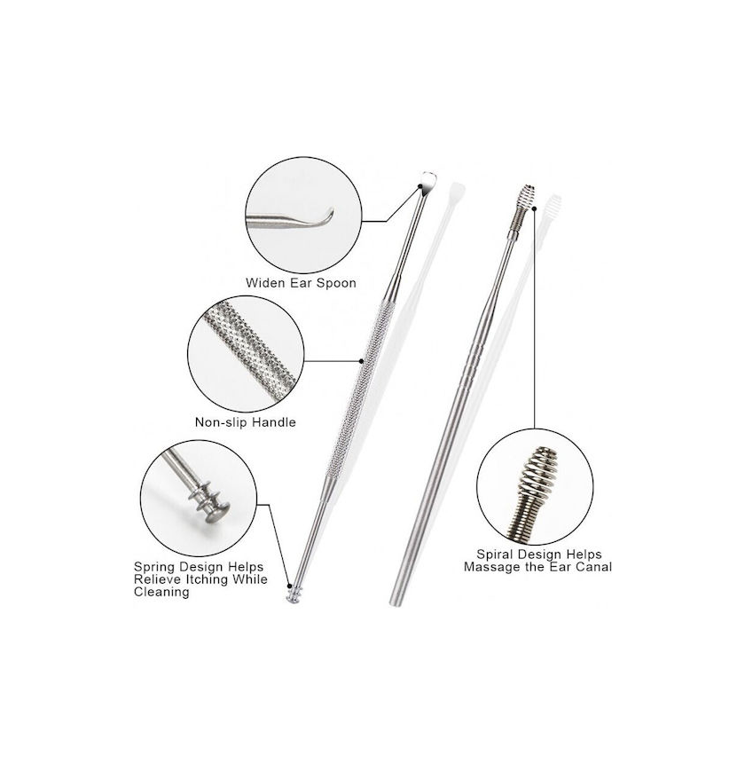 • Εργαλείο καθαρισμού αυτιών: Διαφορετικό από τις μπατονέτες, που μπορεί να σπρώξουν περισσότερο το κερί στο αυτί, η λαβή αυτιού σε σχήμα σέσουλας μπορεί να αφαιρέσει αποτελεσματικά το συσσωρευμένο κερί. Η σπειροειδής σχεδίαση τους με διπλή κεφαλή μπορεί να σας βοηθήσει να κάνετε μασάζ στον ακουστικό πόρο. Επαγγελματική επιλογή εργαλείων για τα αυτιά σας.